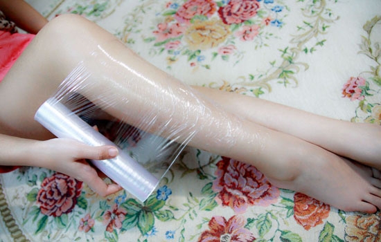 3、等瘦腿精油完全被皮肤吸收后,再用保鲜膜均匀包住按摩过的部位,不可过紧。