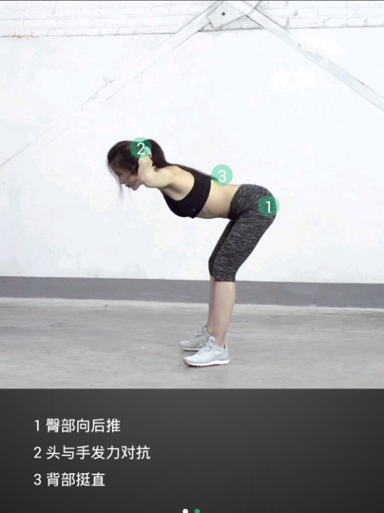 2.腰背挺直,微微屈膝,臀部向后移,向前俯身至最大幅度,大腿后侧有强烈拉伸感。