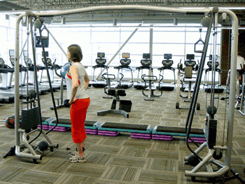 1.面向拉力线方向站立,踝部系缚拉力器负重,脚后跟处是力点。