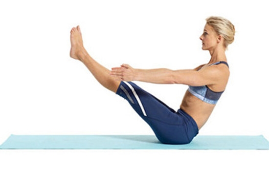 第二步:就这样保持3个呼吸后,背部往后微微降低,同时两腿向前伸直,不要触到地板,呈半船状,保持3次呼吸。