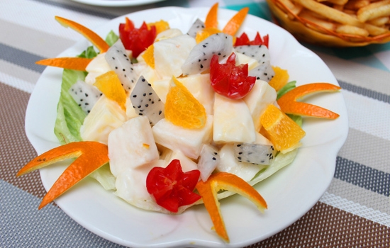 午餐:水果色拉半份、半块黑巧克力、鲜榨萝卜汁一杯