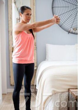 侧向伸展能够让“懒腰”伸得更科学更有助于打造S曲线和小蛮腰。做法:站在床边后,一只手撑住床沿。另一只手手掌朝外,高举过头,然后身体向床的一侧做侧弯运动,同时同侧的脚绕过支撑身体重心的脚,做交叉腿的动作,使得身体形成一个C的形状。抻拉的手和脚一定要伸直,头部抬起眼睛看向天花板,保持2-3个深呼吸后,在做另一侧。