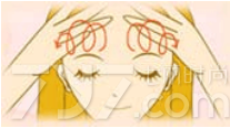 以眉心为基点,划大圈按摩,扩散至整个额头用食指、中指、和无名指,以眉心为基点,向太阳穴方向划圈按摩。皮肤有向上拉扯的感觉,顺势推拿按摩太阳穴。