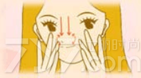 用中指指腹向下顺直轻轻按摩鼻子两侧,有舒展肌肤和防止横纹出现的功效。左右两侧各按摩3次;中指指腹紧贴鼻沟,一点一点上下移动,大约6次。使堆积污垢浮出。为溶化多余的皮脂,要少许用点力。
