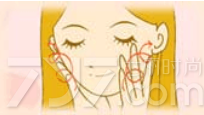 在容易下垂的嘴角处,迅速向上提用中指和无名指的指腹从下唇正中心滑向左右嘴角进行按摩。此举有缓解皮肤松弛的作用,大约3次。