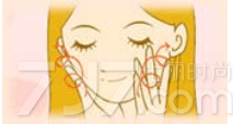 在脸颊部分大幅度按摩以下颚为中心用中指和无名指的指腹,向左右耳方向划圈按摩。手指大幅移动按摩全脸,大约3次。
