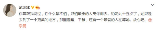 随后,范冰冰在微博发文安慰李晨:“你曾跟我说过,你什么都不怕,只怕最亲的人离你而去。奶奶九十五岁了,她只是去到了一个更美的地方,那里温暖、平静,还有一个最爱的人在等她。放心吧。@李晨”