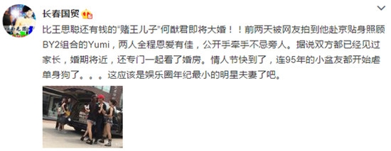 长春国贸原文:“比王思聪还有钱的‘赌王儿子’何猷君即将大婚!!前两天被网友拍到他赴京贴身照顾BY2组合的Yumi,两人全程恩爱有佳,公开手牵手不忌旁人。据说双方都已经见过家长,婚期将近,还专门一起看了婚房。情人节快到了,连95年的小盆友都开始虐单身狗了。。。这应该是娱乐圈年纪最小的明星夫妻了吧。”