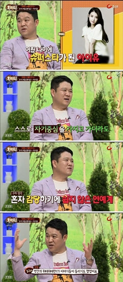 节目中,主持人及嘉宾以“我们的妹妹——IU”为主题,对近来人气暴涨的IU进行了讨论。席间,金九拉表示:“很小的岁数就成为巨星的IU,感觉总是以自我为中心。”话音刚落,在做的嘉宾便询问何出此言。金九拉认为,作为一个小女生要承担这么多传闻十分不易。但确实对IU的负面新闻有所耳闻,并表示十分担心。