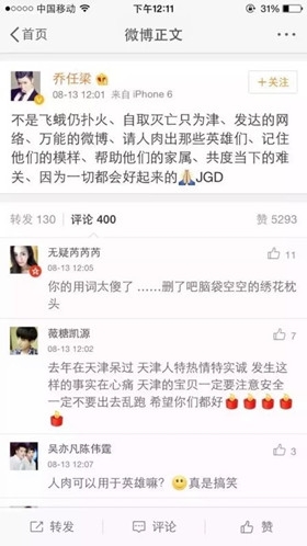 今天中午,演员乔任梁发微博为天津祈福,呼吁帮助搜出消防员的家属共渡难关,把消防员救火喻为“飞蛾扑火”,用到“人肉”“自取灭亡”等词,语言混乱,遭到网友疯狂吐槽,被批“智商感人”、“智商情商双低”。