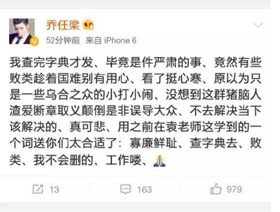 随后,乔任梁再发微博,回应网友的吐槽,称断章取义者是“猪脑人渣”,直接用“败类”“乌合之众”等词来反击网友,更声称“我不会删的”,引发更大一轮吐槽。没过多久,乔任梁删除了这两条微博。