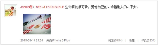 Jackie在长文中写道,自己已经在消防单位工作了十二年,还记得几年前的一场大火,有一个熟识的朋友在大火救人中失去生命,“生命真的很可贵,爱惜自己的,珍惜别人的”,期待每一个喜出望外的好消息。