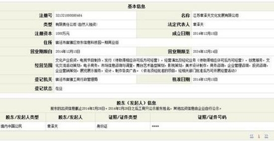日前,有网友爆料奶茶妹妹去年底开了家公司,记者第一时间在江苏省工商局企业信用信息公示系统中查到并证实了此事:奶茶妹妹还真用自己的名字开了家公司--“江苏章泽天文化发展有限公司”。