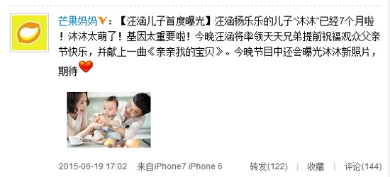 6月19日博主“芒果妈妈”在微博晒出一张汪涵的全家福,他刚出生不久的儿子首度曝光,照片上的一家人其乐融融。博主预告:“汪涵杨乐乐的儿子“沐沐”已经7个月啦!沐沐太萌了!基因太重要啦!今晚汪涵将率领天天兄弟提前祝福观众父亲节快乐,并献上一曲《亲亲我的宝贝》。今晚节目中还会曝光沐沐新照片,期待。”
