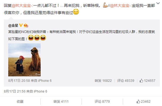 随后也有网友劝金星:金姐我一直都很喜欢你,但是我还是觉得这件事有些过。随后金星回应:一点儿都不过!…再来犯我,斩草除根。