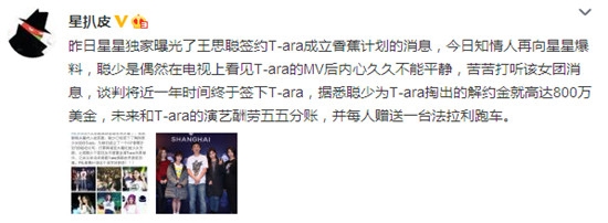 继昨日某爆料号,曝光了王思聪成立“香蕉计划”经纪公司,签下韩国女团T-ara后。今日,再爆猛料,据某知情人透露,聪少是偶然在电视上看见T-ara的MV后内心久久不能平静,苦苦打听该女团消息,谈判将近一年时间终于签下T-ara,据悉聪少为T-ara掏出的解约金就高达800万美金,未来和T-ara的演艺酬劳五五分账,并每人赠送一台法拉利跑车。