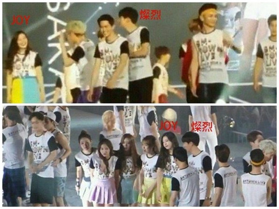 根据这组网民曝光的照片,这是今年7月SM家族在日本举办的演唱会,该网民表示,一开始Super Junior的希澈对着JOY开玩笑,灿烈发现后就一直往JOY的方向看过去,后来希澈跟EXO的队长俊勉一起跟JOY讲话,灿烈就走过去俊勉的旁边,灿烈的眼神一直都是看着JOY,最后还站到JOY旁边。