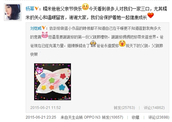 昨天晚上,杨幂在微博发声回应小糯米正面照曝光,称“糯米爸爸父亲节快乐。今天看到很多人对我们一家三口,尤其糯米的关心和温暖留言,谢谢大家,我们会保护着她一起健康成长”,表示了要一直保护小糯米的决心。