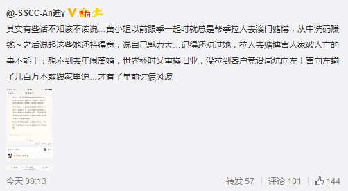 “其实有些话不知该不该说…黄小姐以前跟季一起时就总是帮季拉人去澳门赌博,从中洗码赚钱~之后说起这些她还特得意,说自己魅力大…记得还劝过她,拉人去赌博害人家破人亡的事不能干;想不到去年闹离婚,世界杯时又重操旧业,没拉到客户竟设局坑向左!害向左输了几百万不敢跟家里说…才有了早前讨债风波”