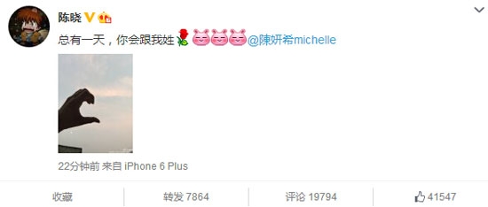 8月26日,有媒体曝光陈晓陈妍希恋情,随后两人的经纪公司也侧面回应了两人的恋情。27日,陈晓在微博上霸气示爱陈妍希:“总有一天,你会跟我姓。”配图是用手比出半颗心。随后陈妍希也发微博同样配图比心,回应了爱人的告白。这也是两人首次正式承认恋情。