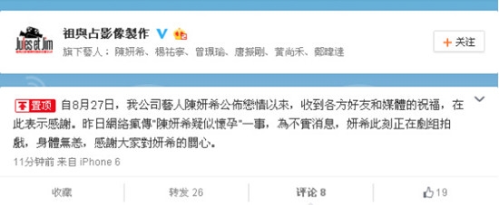 今日上午,陈妍希经纪公司,祖与占影像制作股份有限公司官博发声斥谣,否认陈妍希怀孕,称其正在剧组拍戏。公司在微博上发文感谢好友和媒体对陈妍希恋情的祝福,更直言“陈妍希疑似怀孕”一事为不实消息。此刻,陈妍希正在剧组拍戏,身体无恙。