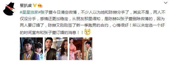 昨日,张子萱清空所有微博,外界认为是因为她和陈赫分手了,很多人都拍手称快,但真相其实不是,据小编所知,两人不仅没分手,感情还更加稳定,从朋友那里得知,是陈赫叫张子萱删除微博的,因为两人要订婚了,陈赫又刚刚签了新一季跑男的合约,心情很好!所以决定选一个好的时间宣布和张子萱订婚的消息。