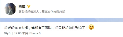 日前,某传媒公司总裁在微博爆料,称黄晓明的婚礼日期已定。“黄晓明10.8大婚,伴郎有王思聪,我只能帮你们到这了!”