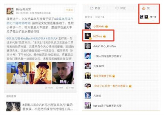 10日,网友“Baby灿灿贤”转发了一条关于吴亦凡的动态并称:“就是这个,上次把吴亦凡当黄子韬 了。”本是一条普通的动态,眼尖的网友却发现黄子韬本人竟然给点赞,于是迅速截图。