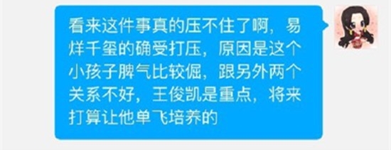 近日,某微博爆料号,再次就易烊千玺遭打压事件,做出了分析,爆料号号称“易烊千玺的确受公司打压,原因是其脾气倔强,与其他两位成员关系不和。”另外,此爆料号还称“王俊凯是三人中的重点,公司计划将来让他单飞”。