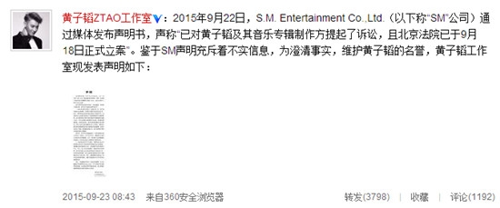 22日,韩国SM发布声明,起诉黄子韬擅自毁约,目前,该诉讼案已于2015年9月18日在北京的法院正式立案。