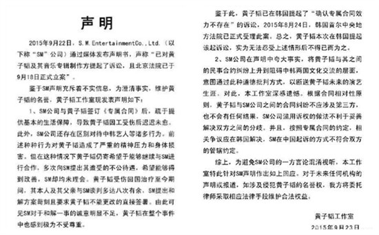 22日,韩国SM发布声明,起诉黄子韬擅自毁约,目前,该诉讼案已于2015年9月18日在北京的法院正式立案。23日,黄子韬工作室发声明,称SM声明充斥着不实信息,欲澄清事实,维护黄子韬的名誉。