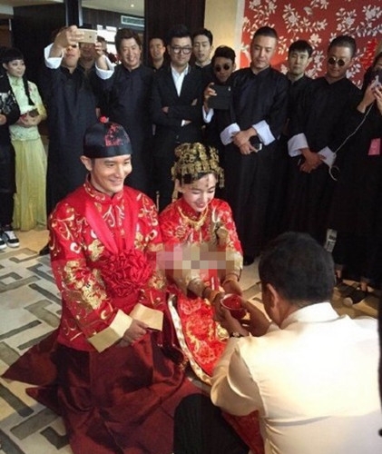 今天,黄晓明Angelababy的婚礼在上海展览中心举行。目前,两位新人身穿大红中式礼服,目前已经进入会场,黄晓明胸前戴大花,正在跪拜双亲敬茶领红包。