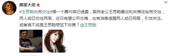 近日,网友圈里大佬爆料,某圈内娱记透露,国民老公王思聪最近和宋茜在秘密交往,两人或已交往两周,近日有望公开恋情,也有消息透露两人或已同居,引发关注。或者难不成是王思聪想签下宋茜?