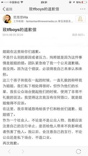 当晚,22时24分,范湉湉发文致歉“作为他们的长辈,我在公众场合提起他们的时候,使用了非常不礼貌的说法。我觉得这次我没有任何借口,就是姐姐做得不应该。”