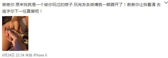 6月24日22点34分,李威前女友通过微博发声,称:“谢谢你,原来我就是一个被你玩过的婊子。玩完发条微博就一脚踢开了!谢谢你让我看清,去追求你下一任真爱吧!”并再晒出一张两人的亲密照。照片中,虽然只有一只女人的手在为另一个人剪指甲,但从照片中手的纹身和露出的花裤子看出,和之前媒体曝光的照片背景一模一样。