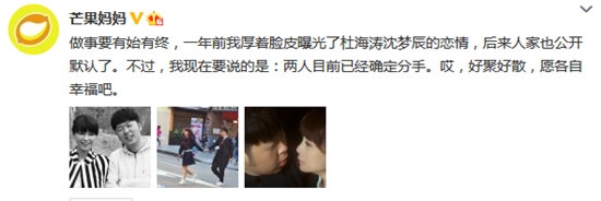 杜海涛、沈梦辰此前暧昧许久,女方更火速走红,在《我是歌手》巅峰会挑梁主持。10月11日,“芒果妈妈”通过微博爆猛料,称杜海涛、沈梦辰已正式分手,“做事要有始有终,一年前我厚着脸皮曝光了杜海涛沈梦辰的恋情,后来人家也公开默认了。不过,我现在要说的是:两人目前已经确定分手。哎,好聚好散,愿各自幸福吧。”