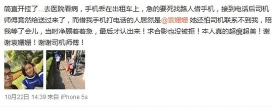 近日,有网友爆料称手机丢失,找人借手机打电话,竟得到袁姗姗帮助。该网友发文称:“简直开挂了...去医院看病,手机丢在出租车上,急的要死找路人借手机,接到电话后司机师傅竟然给送过来了,而借我手机打电话的人居然是袁姗姗,她还怕司机联系不到我,陪我等了会儿,当时净顾着着急,最后才认出来!求合影也没被拒!本人真的超瘦超美!谢谢袁姗姗!谢谢司机师傅!”