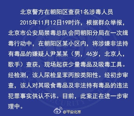 今日,微博“平安北京”曝出46岁男歌手尹某某吸毒被抓的消息。随后,不少网友爆料尹某某尹某某正是著名歌手尹相杰。