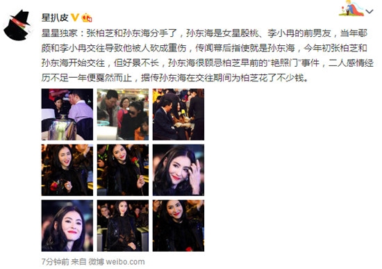 今日,据微博认证为星扒皮的博主爆料,张柏芝与孙东海正式分手男方系星殷桃、李小冉的前男友,更指出当年鄢颇和李小冉交往导致他被人砍成重伤的幕后指使者就是孙东海,今年初张柏芝和孙东海开始交往,但好景不长,孙东海很顾忌柏芝早前的“艳照门”事件,二人感情经历不足一年便戛然而止,据传孙东海在交往期间为柏芝花了不少钱。
