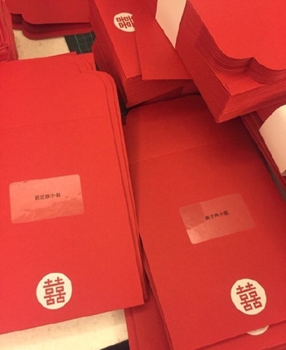 据港媒报道,胡杏儿上月初在其生日派对上宣布将于本月28日与男友李乘德(Philip Lee)结婚,准新娘杏儿最近忙于筹备婚礼,今日她上传一大堆红色喜帖的照片,留言:“请准备收炸弹!!”照片中,一沓沓带“囍”字的红色请帖,已经贴上了宾客的姓名。最前面的两张就是她好姐妹胡定欣同姚子羚的名字。