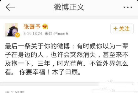 “最后一条关于你的微博:有时候你以为一辈子在身边的人,也许会突然消失,甚至来不及抱一下。三年,时光荏苒。不管外界怎么看。 你要幸福!木子曰辰。”