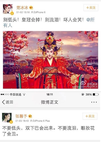 其实张馨予隔空呛声已经不是第一次。年初李晨和范冰冰主演的电视剧《武媚娘传奇》播出时,范爷曾在微博发布“别低头!皇冠会掉!别流泪!坏人会笑!”而时隔不久,张馨予也模仿此句式:“不要低头,双下巴会出来。不要流泪,眼妆花了会丑。”