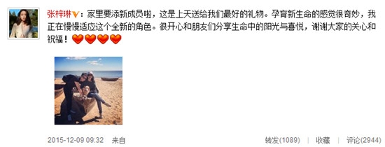 张梓琳在微博上写道,家里要添新成员,她自己也在慢慢适应这个全新的角色,很开心和朋友们分享生命中的阳光和喜悦,并感谢大家的祝福。
