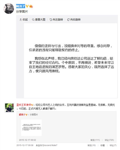 今日(17日)上午,阚清子微博发表声明宣布解约,并表示已经向荣信达公司送达了解约函,结束了双方的经纪合约,各种原因,不再细说。并写道:傻傻的坚持与付出,没能换来对等的尊重。感念尚存,但承诺的违背只能导致契约的终止。