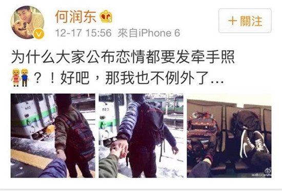 今日,他突然秀出与Peggy的牵手照片,照片只能看到女子的背影,她穿军绿色棉服,搭配牛仔裤和黑色兔耳朵帽子,还背着民族风双肩包,何润东则穿蓝色羽绒服戴蓝色帽子,两人牵手一同出行,均是休闲装扮,推测应该是两人出国旅行所拍。粉丝虽然心里早有底,也都心碎送上祝福“哇!公开了!祝福祝福!”“伤了心的女人怎么办,喜欢了十几年的一个男人,哎~自己偷偷哭一会吧“”别是网红就好“等等。
