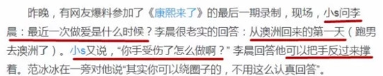 大家都知道小s一向都很开放,喜欢问嘉宾比较私密的问题,在昨天的康熙里,作为最后一期的嘉宾范冰冰和李晨自然也没能逃过小s的“魔爪”。