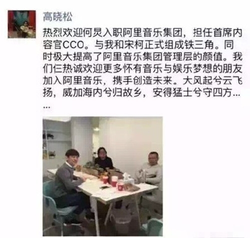 29日,据阿里音乐董事长高晓松微博称,何炅将入职阿里音乐,担任CCO(首席内容官),并晒出两人与CEO宋柯的合影称:“热烈欢迎何炅入职阿里音乐集团,担任首席内容官CCO。与我和宋柯正式组成铁三角。同时极大提高了阿里音乐集团管理层的颜值。我们仨热诚欢迎更多怀有音乐与娱乐梦想的朋友加入阿里音乐,携手创造未来。”随后,阿里音乐官方微博转发确认了此消息。