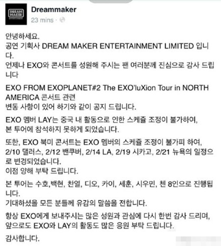 24日,Dreammaker官方Facebook更新公告一则,内容如下:大家好,这是公演企划社DREAM MAKER娱乐公司,十分感谢在任何时候都对EXO及其演唱会给予应援的各位粉丝,演唱会有如下变动,成员张艺兴因繁忙的中国行程不能参加本次EXO北美巡演,因各位成员的行程无法进行调整,故演唱会日期变更为:2/10达拉斯 ;2/12温哥华;2/14LA ;2/19芝加哥;2/21纽约,希望能得到大家的谅解,再次向对EXO给予支持和喜爱的各位表示感谢,希望大家能一如既往地支持EXO及成员张艺兴以后的各种活动。