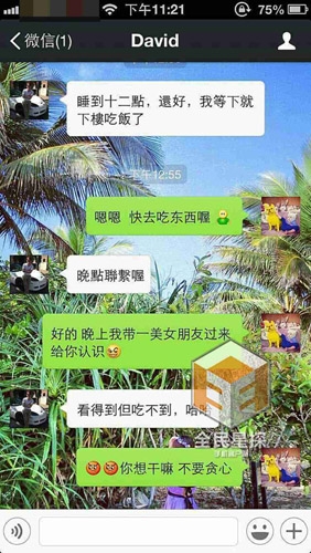 某周六中午,杨子晴称会介绍一位美女朋友给陶喆认识,陶喆旋即称,“看得到但吃不到”,疑暗示想“三人游”。 而某周日晚上十点,陶喆在成都,杨子晴在上海,孤枕难眠的陶喆再次打起了杨子晴的美女朋友的主意,他询问杨子晴,“你的美女朋友要不要来找我呢”。被告知该美女也回家了之后,陶喆颇有“内涵”地回复:“那我要自己努力了。”