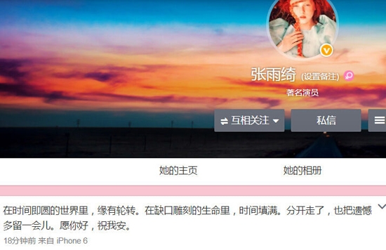 7月2日张雨绮在自己微薄上发文,疑似正式宣布与丈夫王全安离婚。“在时间即圆的世界里,缘有轮转。在缺口雕刻的生命里,时间填满。分开走了,也把遗憾多留一会儿。愿你好,祝我安。”